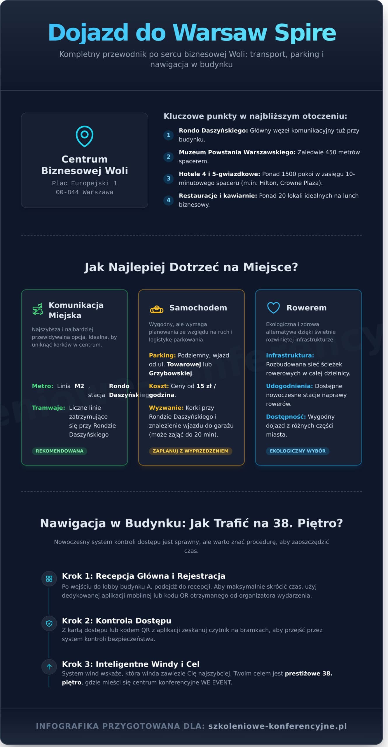 Planując dojazd do Warsaw Spire własnym samochodem, należy kierować się w stronę serca biznesowej Woli. Kompleks zlokalizowany przy Placu Europejskim 1 jest doskonale skomunikowany z głównymi arteriami stolicy. Kierowcy mają do dyspozycji dwa główne wjazdy do garażu podziemnego. Pierwszy z nich znajduje się od strony ulicy Towarowej, natomiast drugi od strony ulicy Grzybowskiej. Oba punkty są wyraźnie oznakowane, co ułatwia nawigację nawet osobom odwiedzającym tę część Warszawy po raz pierwszy.