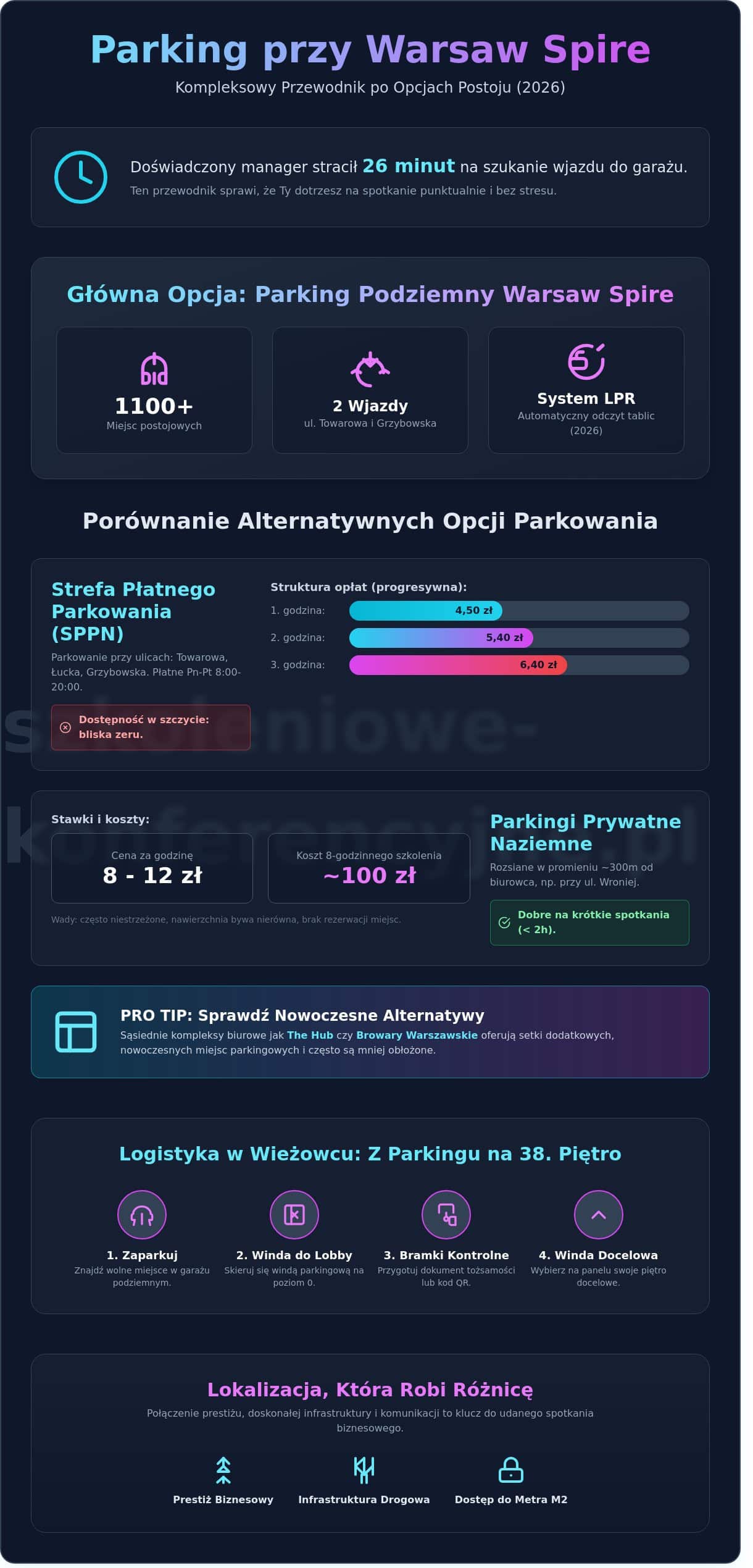 W ubiegły poniedziałek Marek, doświadczony manager z Warszawy, stracił dokładnie 26 minut na krążenie wokół Ronda Daszyńskiego, zanim w ogóle zlokalizował właściwy wjazd do garażu. To powszechny problem, bo znalezienie wolnego miejsca na parking warsaw spire w godzinach porannego szczytu bywa trudniejsze niż dopięcie agendy międzynarodowej konferencji.